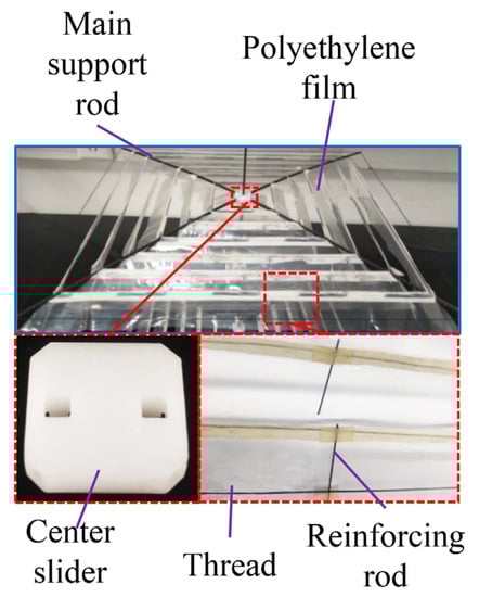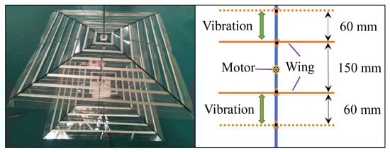 Making a lightweight and strong airfoil is key to achieving hovering flight. Figure 4 shows the design details of the array-spiracle airfoil. Unlike most airfoils, which are made of rods and films, the array airfoil is made of rods, thin wires, and films, which significantly reduces the airfoil mass, while maintaining stiffness. The overall size of the airfoil was 30 × 30 cm, with a mass of 12 g. Four carbon fiber rods were cross-fixed to the central slider. The length, width, and height of the carbon fiber rods were 20 cm, 1.5 mm, and 2.0 mm, respectively. Holes with a diameter of 1 mm were drilled on the side of the rods at 3-cm intervals to facilitate the stringing of polyurethane rubber elastic threads, 0.5 mm in diameter, to form a mesh structure. The polyethylene film was attached to the wire near the center end, and the other end was below the adjacent wire and kept free. The width of the film was 2.5 cm and slightly larger than the spacing between the two wires. The filaments require a certain tension but cannot cause the airfoil to bend, and a carbon fiber rod, 1 mm in diameter and 2.5 cm in length was fixed in the middle of the filaments to enhance the stiffness of the film plume. These designs ensure that the spiracle stack is closed during the downward vibration of the airfoil and open during the upward vibration of the spiracle rotation, thus, generating lift.