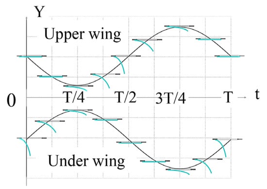 The vehicle design incorporates a layout of double-layered feathers arranged up and down, with both wing surfaces fluttering in reverse at the same speed during flight. Figure 5 shows that the opening and closing of the spiracle unit makes the lift of the lower vibrating airfoil always greater than the drag of the upper array in one cycle; therefore, the entire process generates additional lift to balance gravity and achieve the ascent and hovering of the vehicle. At the same time, the double-layer arrangement of the design promotes the mutual offset of inertial forces during airfoil vibration, which enhances vehicle stability. This driving mode is simple and ensures uniform velocity distribution over the whole wing surface. This is conducive to large loads generated by super-large wing surface drive.