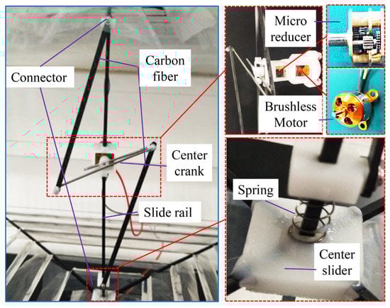 A motor and linkage mechanism were used for the airfoil drive design, as shown in Figure 6. A brushless motor (2200 KV, 11.2 V) and micro-reducer (1:20, 12.6 g) were placed in the middle of the upper and lower airfoils. The center crank was made of hard steel wire, 1.4 mm in diameter, bent with a 30 mm turning radius, and the center crank and center slider of the upper and lower airfoils were connected by a carbon fiber linkage and spring. The springs were used as damping and energy storage/release elements to reduce mechanical shock and energy loss during changes in the airfoil vibration direction.