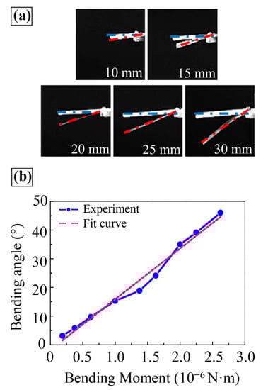 MATLAB software was used to calculate the theoretical model and verify the correctness of the model through experiments. For verification purposes, the time of a cycle was divided into 1000 steps. Starting from the first step, the obtained motion and force state were carried to the second step, in which the state of all moments in a cycle, and change in the opening and closing state of the spiracle with time, were calculated. The active motion of the airfoil frame was a known quantity, and the motion of the frame forced the film to move. Once the film started to move, it generated changing inertial forces and wind resistance. The combination of these two forces and gravity caused the film to bend or stretch, which affected the motion of each element, and this, in turn, affected the forces on the vehicle. The relevant parameters are listed in Table 1. In addition, the bending characteristics of the film were obtained experimentally and used in the calculations. Initially, the film bent under the action of gravity. Figure 10a shows the bending state of the film under the action of gravity for different lengths. The relationship between the bending angle and the bending moment of the film was obtained by measuring its angle, as shown in Figure 10b. The curves were obtained by fitting the data: