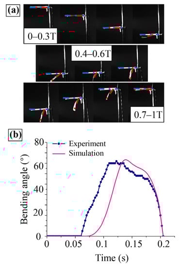 To verify the correctness of the calculated results, the change of the opening and closing angles of the spiracle film in vibration with the same parameters was captured by a high-speed camera, as shown in Figure 12a. The experimental spiracle started to open at time point 0.3 T, reaching the maximum opening angle at time point 0.6 T. The spiracle was completely closed at the end of one cycle. As shown in Figure 12b, the experimental results were compared with the calculated results. It was found that the experimental and theoretical curves closely matched at each important turning time point and the maximum spiracle opening angle was approximately the same. However, the spiracle opening speed in the experiment was faster than the theoretical opening speed, and it reached the maximum angle point before the theoretical time point. The reason might be that the junction between the frame and the film cannot be tightly attached under actual conditions, resulting in an angle of rotation that reduced the reverse torque applied to the film at the junction, thus, making the film easier to open. According to the overall trend, the theoretical and experimental results were consistent, which verified the accuracy of the theoretical and simulation calculations.