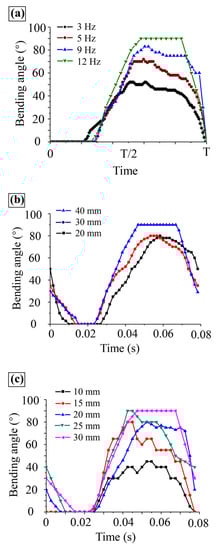 The changes in the spiracle film length, vibration amplitude, and vibration frequency have a great influence on the spiracle opening and closing characteristics. Therefore, the effects of the spiracle opening and closing characteristics were analyzed individually using the control variable method. Figure 13a shows the bending variation of the film in one cycle at different frequencies for a spiracle film length of 30 mm and an amplitude of 40 mm. The variable frequency did not affect the overall opening time of the spiracle, and as the frequency increased, the latter reached the maximum angle; however, its maximum angle also improved the opening and closing performance of the spiracle. When the frequency reached 12 Hz, the spiracle angle was able to open up to 90° and remained at this value for a long time, with excellent opening and closing performance. Figure 13b shows the change in the opening and closing of the plenum film in one cycle with different amplitudes at a vibration frequency of 12 Hz for a plenum film length of 30 mm. Increasing the amplitude increased the spiracle opening speed and angle maximum to a certain extent, and the spiracle maintained the maximum angle for a longer time with an amplitude of 40 mm. Figure 13c shows the opening and closing variations of the plenum film in one cycle for different plenum film lengths with a plenum amplitude of 40 mm and a vibration frequency of 12 Hz. The spiracle opening time point and total opening time were different but similar for different lengths. The opening angle increased with increasing spiracle length, and the increase was followed by a decrease under this parameter condition. The spiracle length of 30 mm exhibited the best opening and closing performance.