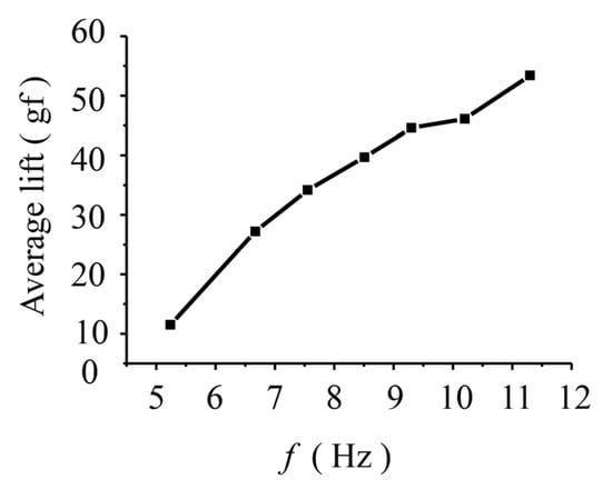 Figure 14 shows the completed prototype. The total mass of the prototype was 52 g (excluding the battery and controller), and the stroke from the highest to the lowest position of the wing was 60 mm. The shortest distance between the two airfoils was 150 mm. Since the inertial forces generated by the symmetric inverse vibration of the two wings cancelled each other out, lift could be directly obtained by fixing the bottom of the prototype to the LH-Z05A (range 1000 g, accuracy 0.05% F.S) piezoresistance mechanical sensor (Shanghai Liheng Company, Shanghai, China). Figure 15 shows the average lift force of the prototype measured in five cycles at different vibration frequencies, which increased as the vibration frequency increased. When the vibration frequency was 11.3 Hz, the lift force exceeded the dead weight of the prototype, allowing hovering flight to be realized, theoretically.