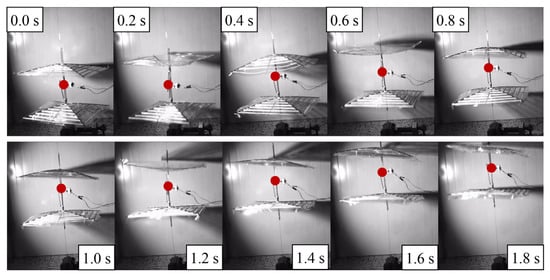 To visualize the flight capability of the prototype, a flight test was conducted under the guidance of a wire vertically threaded into the central rod. Figure 16 shows the vertical takeoff and hovering capability of the prototype by slowly increasing the vibration frequency to achieve vertical takeoff under the wire restraint. The vehicle generated enough lift to leave the support seat and rise 0.4 m in 2 s. The vertical takeoff and hovering abilities of the prototype were visually verified. However, the spiracles were distorted during movement, which caused uneven force distribution and prototype shaking. In future work, it is necessary to improve the selection of the spiracle materials, the wing–skeleton stiffness, and manufacturing process of the array-spiracle wing to solve this problem.
