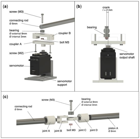 3D renderings of first part of the electromechanical system: (a) exploded view of the coupling between the servomotor output shaft and the ad-hoc designed connecting rod—crank mechanism; (b) perspective to appreciate the 2-mm crank obtained with the 2-level coupler; (c) exploded view of the coupling system between the connecting rod and piston A.