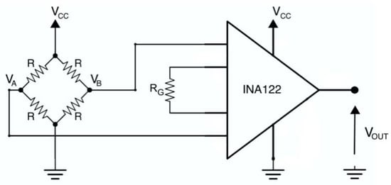 The output voltage of the Wheatstone bridge was amplified by means of an instrumentation amplifier (INA122) [45], and the gain resistor RG was set to 100 Ω (see Figure 4), providing a gain of about 2000 V/V.