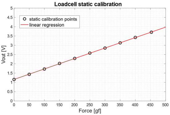 The results of the static calibration of the loadcell are presented in Figure 7. The experimental measurements are represented as circles, while the linear regression is represented as a continuous red line. The angular coefficient of the regression line was 0.006 [V/gf], whereas the coefficient of determination R2 of the linear regression was 0.99, thus confirming the linear behavior of the loadcell.