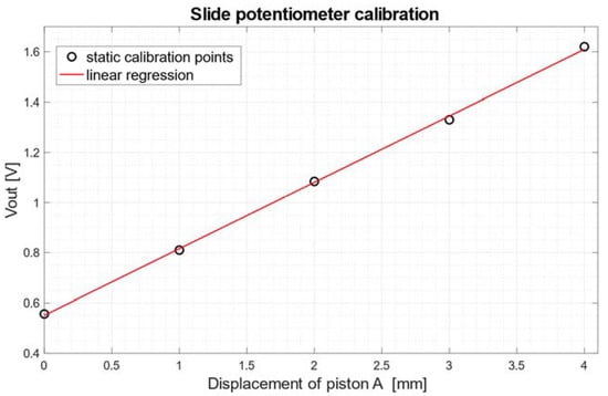 The results of the static calibration of the slide potentiometer fixed to piston A are shown in Figure 8. The experimental measurements are represented as circles, while the linear regression is represented as a continuous red line. The angular coefficient of the regression line was 0.26 [V/mm], whereas the coefficient of determination R2 of the linear regression was 0.99, thus confirming the linear behavior of the potentiometer.