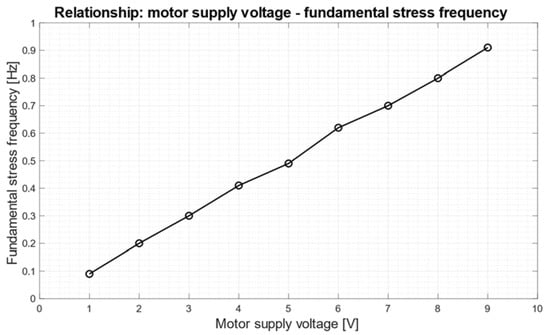 A first test was aimed at determining the relationship between the motor supply voltage, which is related to its rotational speed, and the sinusoidal stress frequency generated. In addition, the total harmonic distortion (THD) was computed to assess the purity of the sinusoidal stress delivered. In particular, the THD referred to the fundamental frequency was computed as the ratio of the RMS value of the sum of all higher harmonics to the RMS of the fundamental component [46], as reported in Equation (4):