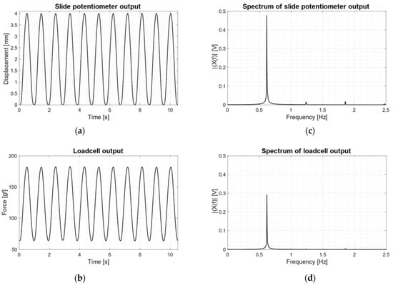 For each motor supply voltage (1 V to 9 V), both the slide potentiometer and the loadcell signals were found to be almost pure sinusoids at the same frequency. As an example of sinusoidal stress generated by the electromechanical system, Figure 10 shows the results obtained by supplying the motor with 6 V, which resulted in a stress frequency of 0.62 Hz: panels (a) and (b) show, respectively, the outputs of the slide potentiometer and the loadcell in the time domain, while panels (c) and (d) show the corresponding frequency spectra (computed over about 3 min of recordings after DC removal). Both spectra show a narrow pulse at the fundamental frequency and spurious pulses at higher frequencies, but with lower amplitudes.