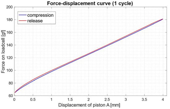 A further test was aimed at verifying the relationship between the force exerted by piston A as a function of its displacement. In detail, the end of piston B is placed in direct contact with the loadcell, so that during the compression-release cycles, the excursion of piston A is largely absorbed by the spring, which will shorten/lengthen by the same amount as the forward/backward displacement of the piston A, while the force exerted by piston A is totally transferred to piston B and in turn to the loadcell.