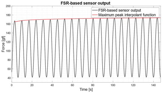 FSR-based sensor output and interpolation function of its maximum peaks (red line) for motor stress frequency of 0.09 Hz (motor power supply set to 1 V).