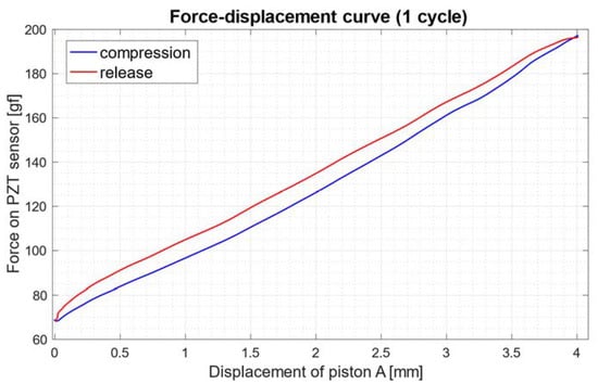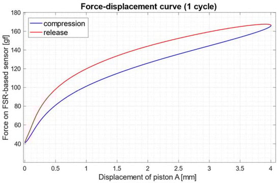 In addition, the relationship between the force impressed on the FSR-based sensor and the displacement of piston A was evaluated, in order to measure the hysteresis generated by the sensor at the various stress frequencies.