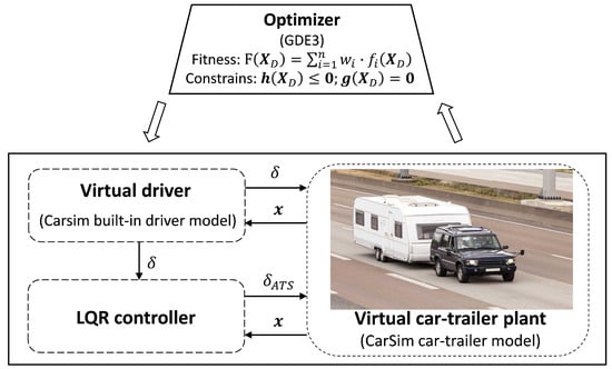 This research proposes a 2-layer optimization method for determining the LQR-based gain scheduling controllers (GSCs) for car–trailer combinations with active trailer steering. Figure 1 shows the framework of the 2-layer optimization method. At the upper layer is an optimizer, e.g., GDE3, while at the lower layer are the dynamically coupled vehicle system, including a virtual car–trailer plant; e.g., CarSim car–trailer model; virtual driver, such as CarSim built-in driver model; and an LQR-based controller.