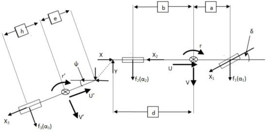 where Equations (9)–(11) govern the longitudinal, lateral and yaw motions of the trailer, respectively,  is the mass of the trailer,  forward speed of the trailer,  lateral speed of the trailer,  is the yaw angle of the trailer,  is the moment of inertia of the trailer and h and e are described in Table 2.