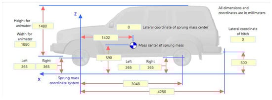 The car–trailer model for the co-simulation is directly developed and tested in CarSim software. Figure 3 and Figure 4 show the details of the car and trailer sub-models used in the co-simulation and Figure 5 is an image of the car–trailer model from CarSim created using these parameters.