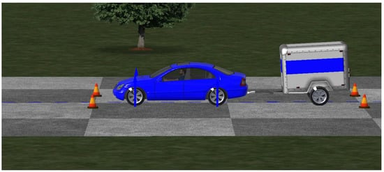 A typical car–trailer system consists of a leading vehicle unit, supplying the power to the combination, and a trailing unit, connected with a mechanical hitch. The hitch connection between the vehicle units generates several mechanical constraints, making the dynamics and kinematics of this combination more complex to investigate compared to a single-unit vehicle, e.g., car or truck. Due to the unique dynamics of the combination and the mechanical constraints, the car–trailer system usually experiences unstable motion modes that could lead to fatal accidents. Typical unstable motion modes that lead to crash of car–trailer combinations are trailer-sway, jackknifing and rollover []. Several factors can lead to each of the aforementioned unstable motion modes, e.g., high-speed evasive maneuvers, crosswinds, road conditions and payload variation of the trailer [].