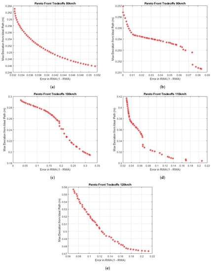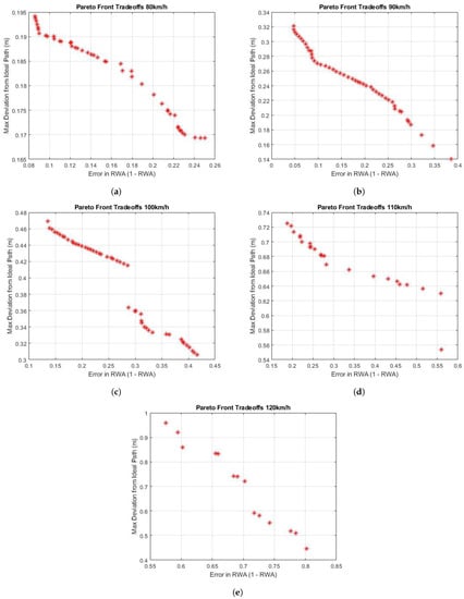 Optimal Pareto-fronts for vehicle speeds from 80 to 120 km/h and 0.1(s) driver model reaction time. (a) Optimal Pareto-front for 80 km/h and 0.1(s) driver model reaction time. (b) Optimal Pareto-front for 90 km/h and 0.1(s) driver model reaction time. (c) Optimal Pareto-front for 100 km/h and 0.1(s) driver model reaction time. (d) Optimal Pareto-front for 110 km/h and 0.1(s) driver model reaction time. (e) Optimal Pareto-front for 120 km/h and 0.1(s) driver model reaction time.