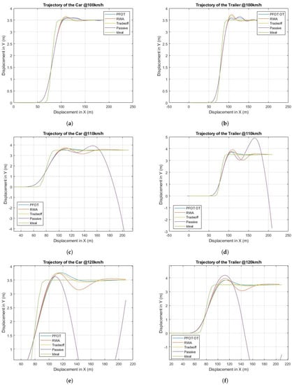 For all 10 vehicle speed and reaction time combinations listed in Table 4, we performed the SLC maneuver shown in Figure 6 for gains corresponding to an optimized PFOT (a utopia point), optimized RWA (the other utopia point), the trade off point, and the passive system without ATS. These results are shown in Figure 10 and Figure 11. For these graphs the ideal SLC path is also included for reference. In Figure 10, car and trailer tracking results are shown commencing at a vehicle speed of 100 km/h as the results at the lower speeds are fairly stable. For Figure 11 results are shown commencing at a vehicle speed of 90 km/h as the tracking performance degrades significantly for the passive case at this speed and higher. It should be noted that in Figure 10 and Figure 11, with respect to the case of passive (without active trailer steering), the differences among the curves corresponding to the cases of PFOT, RWA and Trade off appear not evident. This implies that compared with the passive design without ATS, the three ATS design solutions show much better performance although there exist evident differences among the three ATS designs. A close observation of Figure 10e indicates that among the three ATS designs, the PFOT shows the best overall trajectory-tracking performance, and the RWA exhibits the worst trajectory-tracking performance.