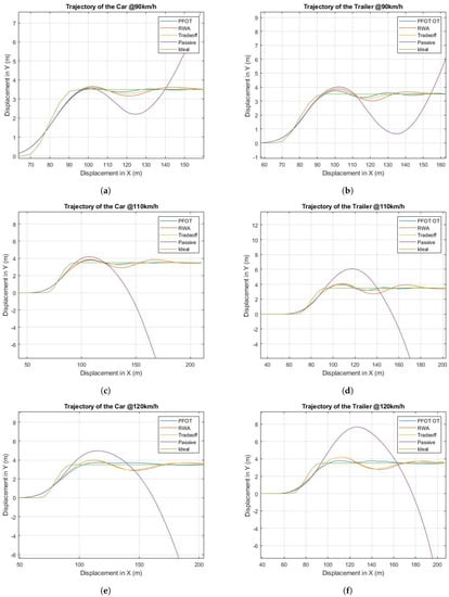 Trailer and car trajectories for speeds of 90 to 120 km/h and 0.1(s) driver model reaction time. (a) Trajectory of the car at 90 km/h and 0.1(s) driver model reaction time. (b) Trajectory of the trailer at 90 km/h and 0.1(s) driver model reaction time. (c) Trajectory of the car at 110 km/h and 0.1(s) driver model reaction time. (d) Trajectory of the trailer at 110 km/h and 0.1(s) driver model reaction time. (e) Trajectory of the car at 120 km/h and 0.1(s) driver model reaction time. (f) Trajectory of the trailer at 120 km/h and 0.1(s) driver model reaction time.