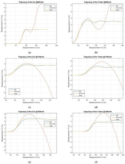 Trailer and car trajectories for speeds of 90 to 120 km/h and 0.1(s) driver model reaction time when the GSC scheduling scheme is applied. (a) GSC Trajectory of the car at 90 km/h and 0.1(s) driver model reaction time. (b) GSC Trajectory of the trailer at 90 km/h and 0.1(s) driver model reaction time. (c) GSC Trajectory of the car at 110 km/h and 0.1(s) driver model reaction time. (d) GSC Trajectory of the trailer at 110 km/h and 0.1(s) driver model reaction time. (e) GSC Trajectory of the car at 120 km/h and 0.1(s) driver model reaction time. (f) GSC Trajectory of the trailer at 120 km/h and 0.1(s) driver model reaction time.
