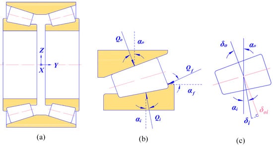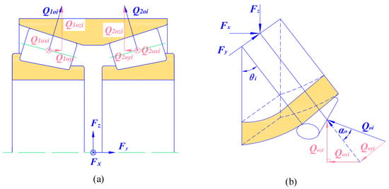The tapered roller bearing, composed of outer ring, inner ring, rolling elements and cage, has a complex behavior. Its raceway is conical and has strong bearing capacity, which can bear the combined radial and axial load. The basic structure of double row tapered roller bearings is shown in Figure 2a. Take out a roller for analysis, as shown in Figure 2b. Qi represents the contact force between the roller and inner raceway, Qo represents the contact force between the roller and outer raceway, Qf represents the contact force between the roller and the inner ring flange, αi, αo and αf are their contact angles, respectively. When the roller is in equilibrium, its forces satisfy the following balance equation: