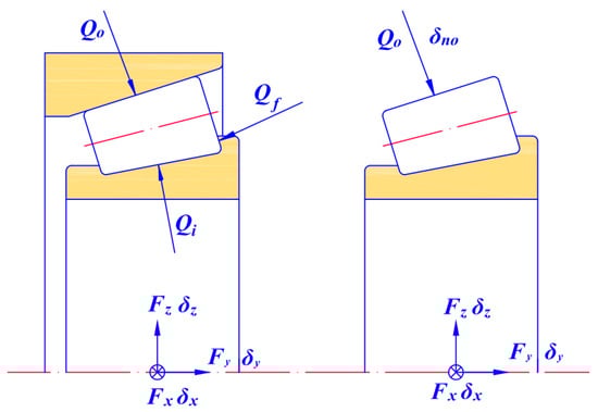 When the bearing is loaded in X, Y and Z directions, the inner ring will displace relative to the outer ring, which are δx, δy and δz, respectively. From the stress analysis of tapered roller bearing, it can be seen that there is only one contact load Qo between the roller and the outer raceway. Therefore, the roller-inner ring system can be studied as a whole part, as shown in Figure 3. In this way, the contact force between each roller and the outer raceway Qoi are decomposed in the three directions of X, Y and Z, and then superimposed to balance with the external load.