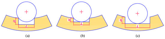 The excitation generated by the roller at the defect can be divided into two cases, which are related to the size of the defect. One is that the width of the defect is smaller than the diameter of the roller, and the roller only contacts the edge of the defect. Take the outer ring defect as an example, as shown in Figure 5a,b, in this case, the bearing will generate impact excitation. The other is that the width of the defect is larger than the diameter of the roller, at this time, the roller will not only contact the edge of the defect, but also sink into the bottom of the defect to contact it, as shown in Figure 5c. In this case, the bearing will not only generate impact excitation but also harmonic excitation.