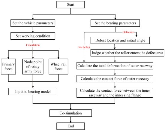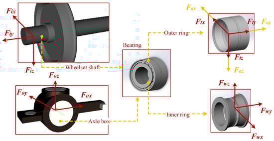 The inner ring and outer ring of the bearing are coupled with the vehicle through the interaction of forces. The bogie frame is connected to the axle box through the primary suspension and the node point of rotaty arm. On the one hand, the force generated by the primary suspension (Ft) and the node point of rotaty arm (Fa), respectively, exert on the outer ring of the bearing through the axle box. The wheel-rail force (Fw) is generated by the contact between the wheelset and track exerts on the inner ring of the bearing through the axle. On the other hand, the contact force generated by the roller-outer raceway (Fo) exerts on the axle box of the vehicle model through the outer ring. The contact force is generated by the roller-inner raceway (Fi) and the contact force generated by the roller-inner ring flange (Ff) exert on the wheelset of the vehicle model through the inner ring. In this way, the coupling of bearing model and vehicle model is realized through the transmission of forces, which is shown in Figure 9.