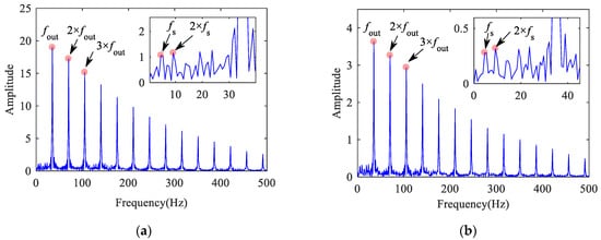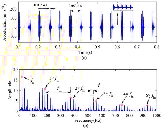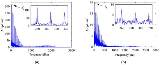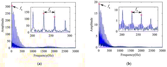 Frequency spectrum of inner ring acceleration of bearing with inner raceway defect: (a) vertical; (b) lateral.