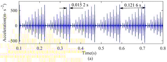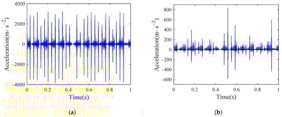 Time history of inner ring acceleration of bearing with roller defect: (a) vertical; (b) lateral.