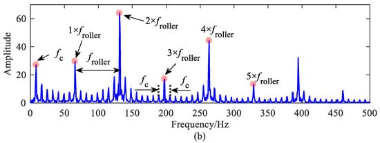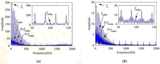 Frequency spectrum of inner ring acceleration of bearing with roller defect: (a) vertical; (b) lateral.