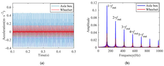 Inner ring acceleration at speed of 150 km/h: (a) vertical; (b) lateral.