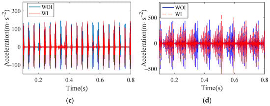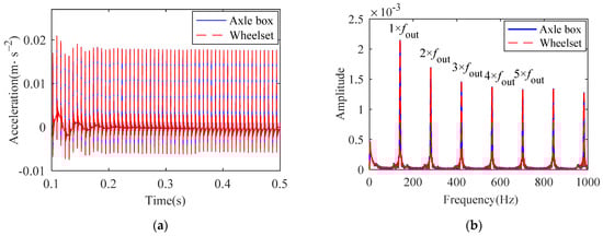 Axle box bearing are also affected by external excitation. Wang et al. [48] studied the influence of wheel polygon wear and nonlinear wheel rail force on the contact force between rollers and raceway; the results showed that the influence of high-order wheel polygon wear on the force was more significant than that of low-order wheel polygon wear. Liu et al. [49] analyzed the dynamic response and slip phenomenon of motor bearing under irregularities; the results showed that locomotive vibration caused by track irregularity and gear meshing will lead to alternating loads, result in high dynamic contact and friction between rollers and raceways. Zha et al. [50] studied the impact of flat scar impact on the bearing outer ring force; it was concluded that the impact load in the loaded zone was larger than that in the unloaded zone, which was distributed symmetrically. The closer to the symmetry axis, the greater the impact load on the raceway.