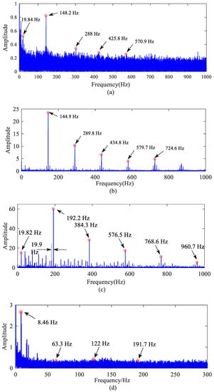 The contact frequency between the flat scar and the rail is equal to the SFR [37]. Figure 31, Figure 32, Figure 33 and Figure 34 show the frequency characteristics of the inner ring acceleration in four cases. In the low frequency section of 0–600 Hz, there are obvious SFR and its double-frequency. When the bearing defect exists, the FCFO and FCFR can be found in Figure 32 and Figure 34, respectively, but the FCFI cannot be found in Figure 33. In addition, the fault characteristic frequency of the bearing in the low frequency section will be covered by the SFR, while that in the high frequency section will gradually appear, especially in the lateral direction. Therefore, when there is flat scar on the wheel with high vehicle speed, it is difficult to detect the inner raceway defect. In addition, it may be relatively easier to detect the bearing defect by selecting the lateral direction and the high frequency section.