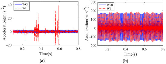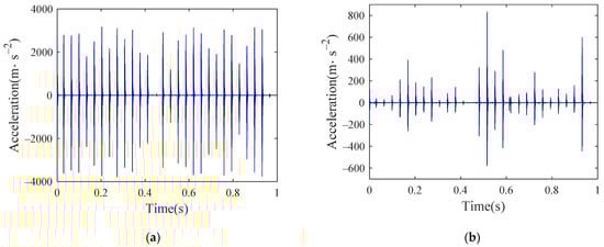 Inner ring acceleration at speed of 300 km/h: (a) vertical; (b) lateral.