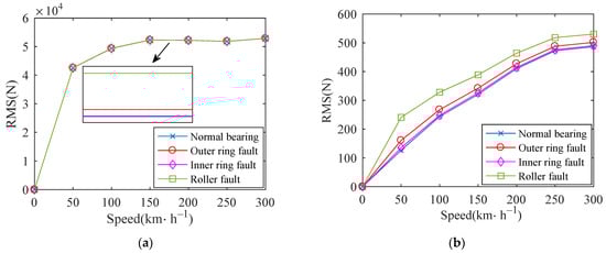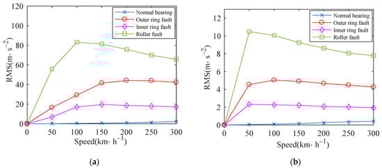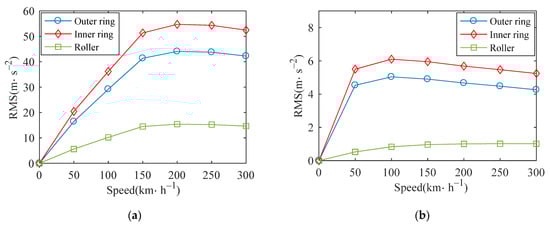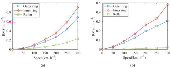 - The vibration characteristics of the system under different train speeds are studied. The results show that with the increase of train speed, the RMS value of each element of normal bearing increases gradually. When the bearing has defects, the RMS values gradually increase but tend to be stable. When the roller has a defect, the vibration of the bearing is relatively intense, followed by outer raceway defect and inner raceway defect;
