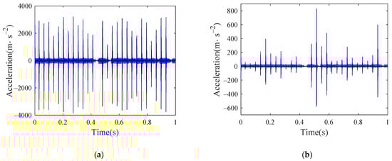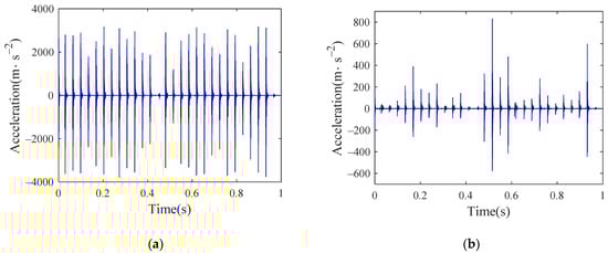 Inner ring acceleration at speed of 200 km/h: (a) vertical; (b) lateral.