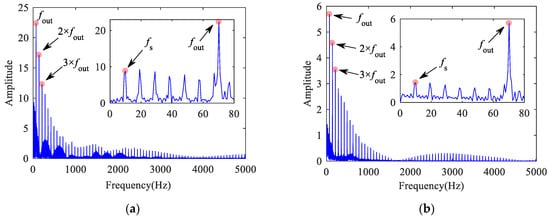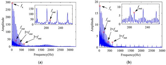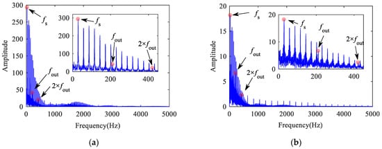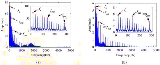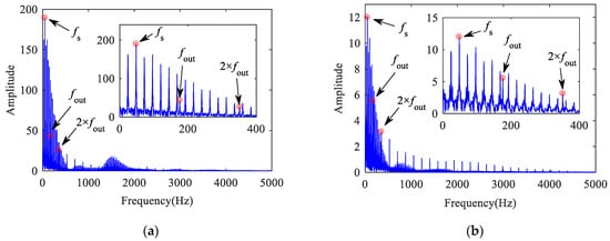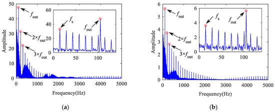 Frequency spectrum of inner ring acceleration of bearing with outer raceway defect: (a) vertical; (b) lateral.