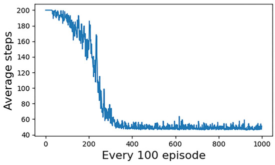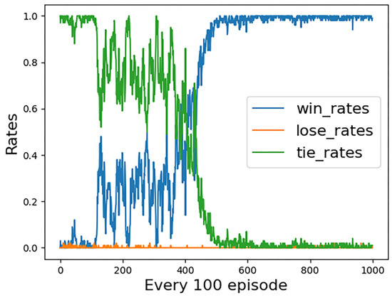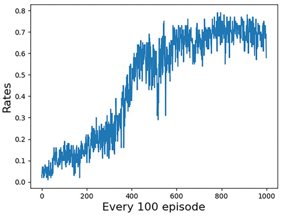 The simulation results of the first group of experiments are given. Figure 6 shows the reward convergence of our UCAV. At the beginning of the training, the episode reward is very low, and there is a tendency for random fluctuations, which indicates that our UCAV is almost in a random exploration state at the early stage of the training. Around the 300th training stage, the reward begins to converge and eventually converges to close to the value of 0. Figure 7 shows the statistical trend curve of episode steps, and Figure 8 shows the change curve of our UCAV win rate. The enemy UCAV is steady and straight and our UCAV is in the exploration stage in the early stage, so both sides have been tied, and the step number of the episode is kept at the maximum number of steps. It is not until the 50th training stage that our UCAV begins to learn the tactics to defeat the enemy UCAV. During this period, it still keeps exploring, but the win rate gradually increases and the average number of episodes gradually decreases. At about the 350th training stage, the number of episodes tends to be stable, converging to about 47 steps, and the win rate of our UCAV also converged to about 0.95.