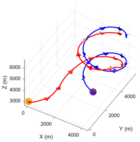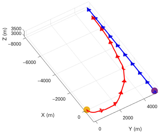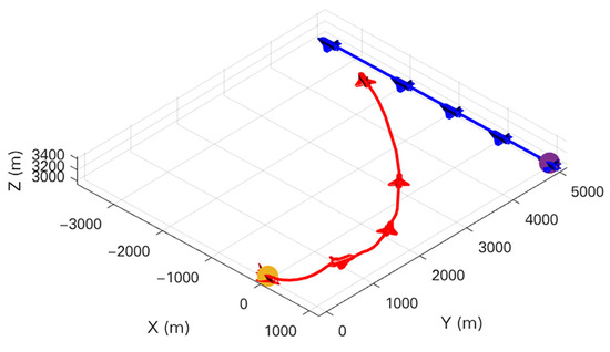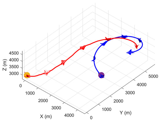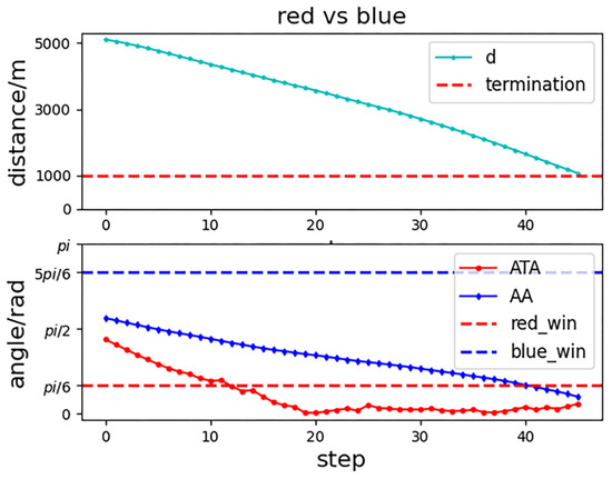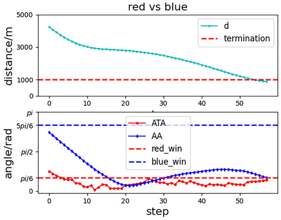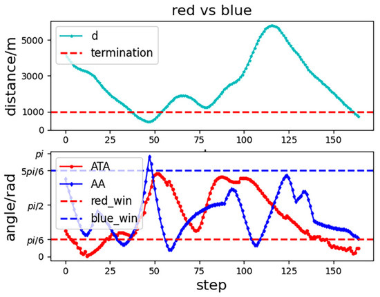 To show our UCAV learning situation in the training process more visually, the trajectory of two UCAVs in certain episodes in the middle and late training period is selected in the first experiment as shown in Figure 9 and Figure 10. After a certain stage of training, the network parameters of the Actor–Critic have been preliminarily formed, which can purposefully guide our UCAV to make favorable actions, such as raising the height to gain a height advantage, going around behind the enemy UCAV to gain an angle advantage, and narrowing the distance to win air battle. In the later stage of training, the network parameters of the Actor–Critic continue to be updated and optimized, and our UCAV has learned the strategy to win at a faster speed. Figure 11 shows the changes in , and distance d in the late training period. When the distance is less than 1000 m and the deviation angle and detachment angle are less than , our UCAV wins.