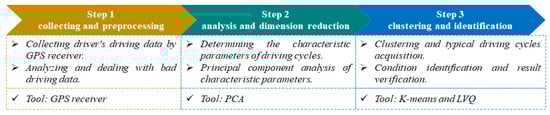 The main goal of naturalistic driving data mining is to obtain the typical driving cycle information representing driving characteristics. In order to achieve the above goal, it is necessary to collect a large amount of driver’s driving data, process and classify the data, and obtain typical driving cycle information from the classification results. As shown in Figure 1, typical driving cycle information obtained from naturalistic driving data mining is mainly divided into three steps, and the tools used in the three steps are also shown in Figure 1.