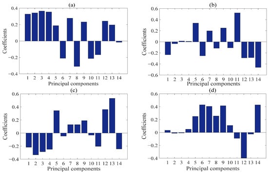 Load coefficient of the first four principal components: (a) The 1st PC; (b) The 2nd PC; (c) The 3rd PC; (d) The 4th PC. PC: principal component.