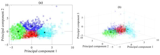 Due to the K-means clustering algorithm’s strong adaptability, the K-means clustering method was used to classify the driving cycle segments based on the results of the PCA algorithm, and the corresponding typical driving cycle clusters were obtained. All 1682 driving cycle segments were divided into 4 types. To display the clustering results more intuitively, Figure 5a,b represent the two-dimensional and three-dimensional graphs composed of principal component 1, principal component 2, and principal component 3, respectively. The black mark in Figure 6 is the cluster center of each type, indicating that the spacing of each center is basically the same and the classification is relatively uniform.