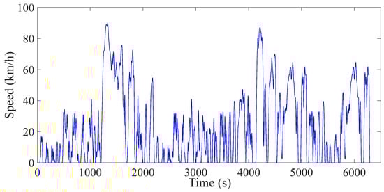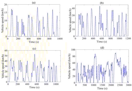 According to the clustering results, representative driving cycles were selected from each type in this paper (see Figure 6), which respectively represented the congested roads in urban areas, relatively unobstructed roads in urban areas, unobstructed roads, and expressways in urban areas.