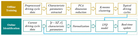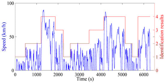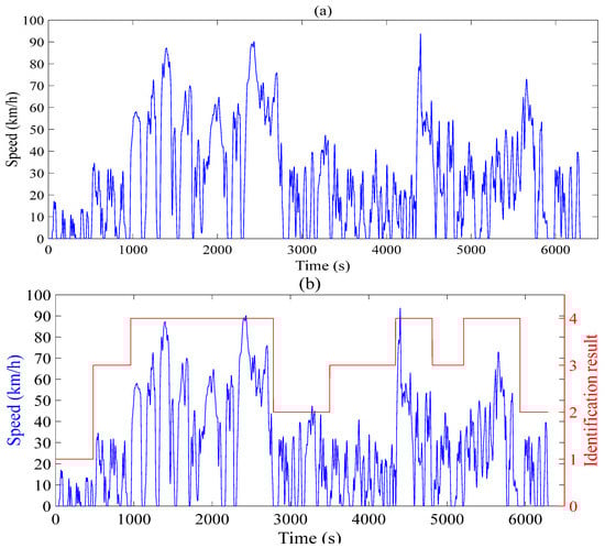 Learning Vector Quantization (LVQ) is a neural network identification method, which has strong learning and adaptive capabilities. The LVQ algorithm was adopted to identify the driving cycle in this paper, and the LVQ algorithm could be divided into two parts: offline training and online identification (see Figure 7). The parameters of the cycle identification period and period update time in the LVQ algorithm have a great influence on the process and results of cycle identification. Considering the identification accuracy and calculation load comprehensively, the cycle identification period was selected as 120 s, and the period update time was 3 s in this paper. To verify the accuracy of the LVQ algorithm, a long-term (more than 6000 s) random cycle was selected from the preprocessed naturalistic driving database (see Figure 8a), and the trained LVQ algorithm was used to identify the cycle (see Figure 8b).