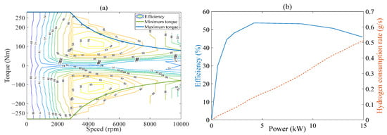 The motor and fuel cell system efficiency: (a) Motor efficiency; (b) Fuel cell system efficiency.