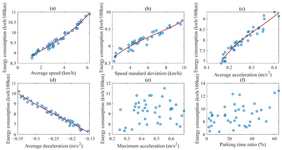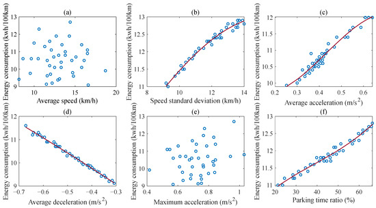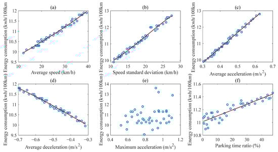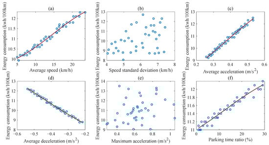 Characteristic parameters and energy consumption under typical driving cycle 3: (a) Average speed and Energy consumption; (b) Standard deviation of vehicle speed and Energy consumption; (c) Average acceleration and Energy consumption; (d) Average deceleration and Energy consumption; (e) Maximum acceleration and Energy consumption; (f) Parking time ratio and Energy consumption.