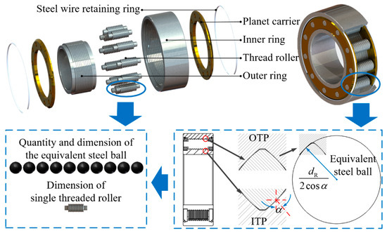 Since the operating principle of PTRB has been described in detail in the author’s previous paper [17], this paper only gives a brief introduction. As shown in Figure 1, PTRB consists of a threaded roller, an inner ring, an outer ring, a planet carrier, and a steel wire retaining ring. Multiple evenly spaced rings of annular threads (zero-lead threads) are machined on the threaded roller, inner ring, and outer ring. The thread teeth of the inner ring and outer ring are in a plane or double-sided arc form, and the threaded roller’s thread teeth are in a double-sided arc form, with an arc radius smaller than the other two. The contact pair formed by mutual contact between the annular thread of the inner ring and that of the threaded roller is defined as an inner ring-threaded roller contact pair (ITP), and the contact pair formed by mutual contact between the annular thread of the outer ring and that of the threaded roller is defined as an outer ring-threaded roller contact pair (OTP). Each contact pair can be regarded as the mutual contact between an equivalent steel ball and a plane or arc surface.