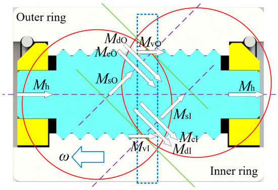 The schematic diagram of each friction torque is shown in Figure 2. Among all friction torques, Me, Ms, and Ms were determined by the external load, structural performance, and material characteristics; Mh was determined by the structural performance and bearing speed; Mv was not only associated with the external load, structural performance, and material characteristics, but also affected by the bearing speed and lubricant type.